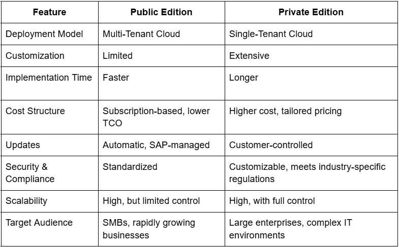 The following table highlights key differences between SAP S/4HANA Cloud Public and Private Editions: